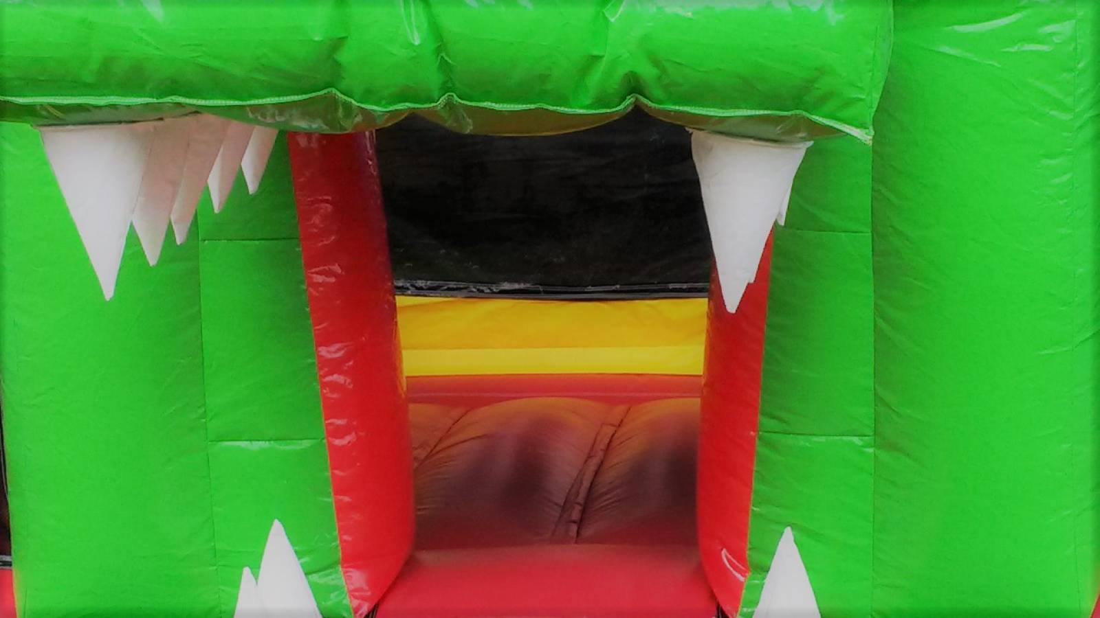 Ce château gonflable en forme de crocodile avec la bouche ouvert correspond totalement a des enfants de 3 a 8 ans. l'entrée se fait par la bouche qui mène ensuite a un espace de jeux coloré et avec des obstacles .